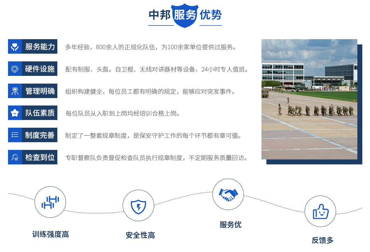 中邦服務簡介 安徽中邦保安服務有限公司總公司成立于2019年。公司 成立以來,始終以“文明值勤、優(yōu)良服務、客戶至上、安全為先” 為宗旨,以保一方平安為已任,面向社會各界等提供有償保安護 衛(wèi)、技術防范、保安培訓,是一家專業(yè)化保安服務公司。目前, 公司下為200多家客戶單位提供周到安全的保安服務,遍布全省 及周邊地區(qū),現(xiàn)有各類專業(yè)人員和保安員2000余名。 中邦服務宗旨 安徽中邦保安服務有限公司是為適...